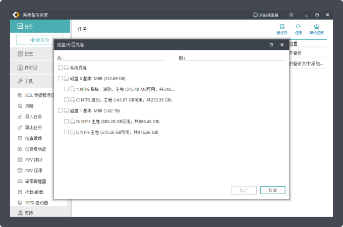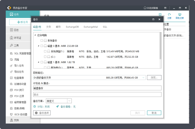 创建新的磁盘、分区、系统、邮件以及文件备份任务。